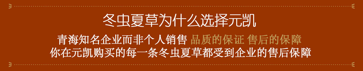 公司專業(yè)致力于青藏高原野生冬蟲夏草銷售、采收、精選包裝和現(xiàn)代化生產(chǎn)、研發(fā)等,并且在青海玉樹西藏那曲設立了采購站,專門采購地道的野生冬蟲夏草,充分保證了產(chǎn)品的品質。元凱長期向國內眾多著名藥材經(jīng)銷商、港澳臺以及東南亞中藥材采購商供應冬蟲夏草,多次被省、市、縣授予多種榮譽稱號“青海省知名商標”、“青海省誠信單位”、“青海省名優(yōu)企業(yè)”、“守合同重信用企業(yè)”等。